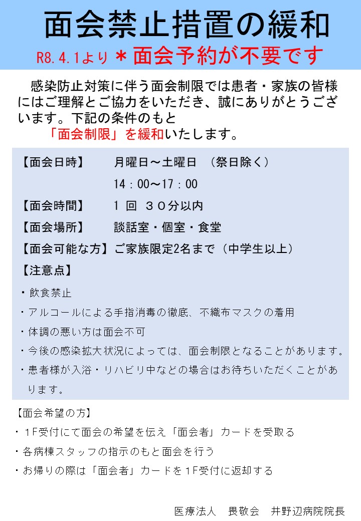 令和5年5月8日に新型コロナウイルスが5類感染症へ移行されるに伴い、面会制限を緩和しました。